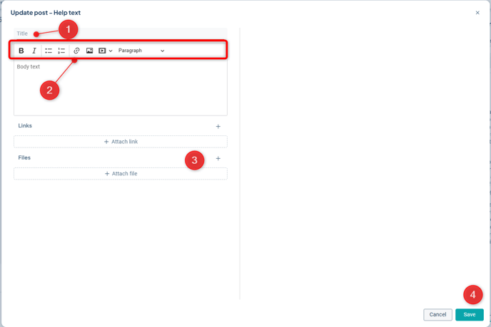 2) Write the main content in the large text box. You can format the text and add links, images, and videos using the toolbar.