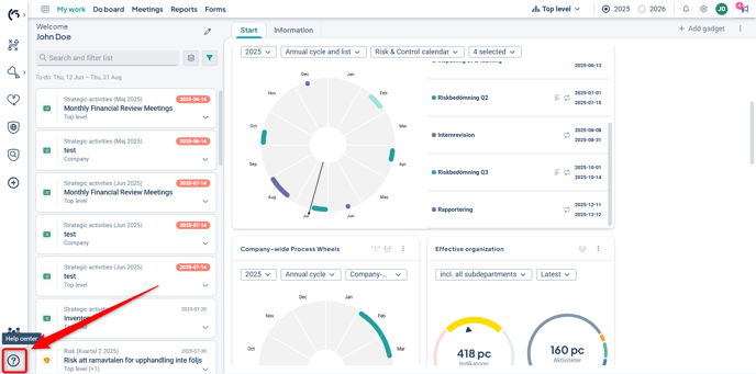All users have access to the Stratsys Help Center after logging in. You can access the Help Center via the question mark icon in the bottom left corner: