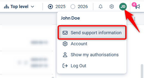The same applies when using “Send support information,” which we always ask you to send when calling our support. You’ll find the "Send support information" menu under your user picture/user initials in the top right corner.