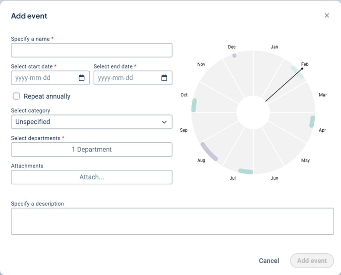 Creating an event is a great way to get an overview of what and when things should be done and to spread this information within the organization. It is possible to make events recurring annually to save time."