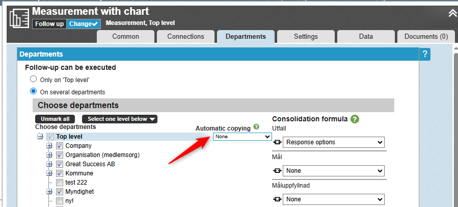 Hover the mouse just below the heading Automatic copying, which you'll find roughly in the middle, near the top of the Departments tab. A dropdown list will now appear.