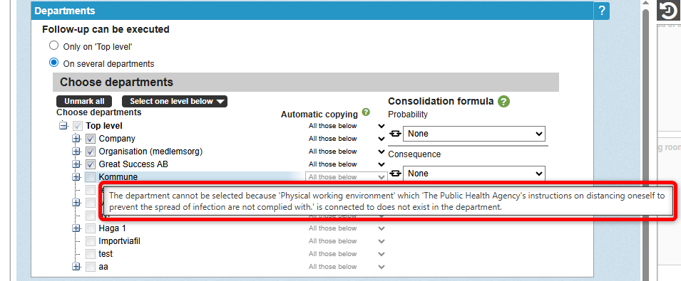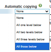 Select the level from which you want automatic copying to occur and how many levels down it should be applied. If you want all new departments to receive the measure/activity, choose All those below from the top level of the measure.