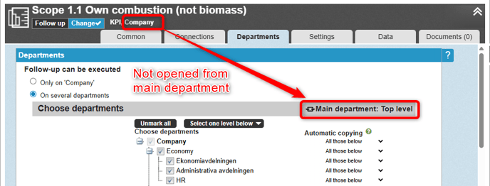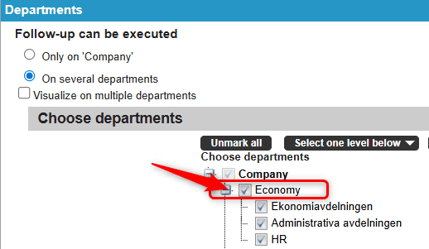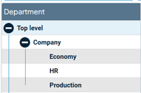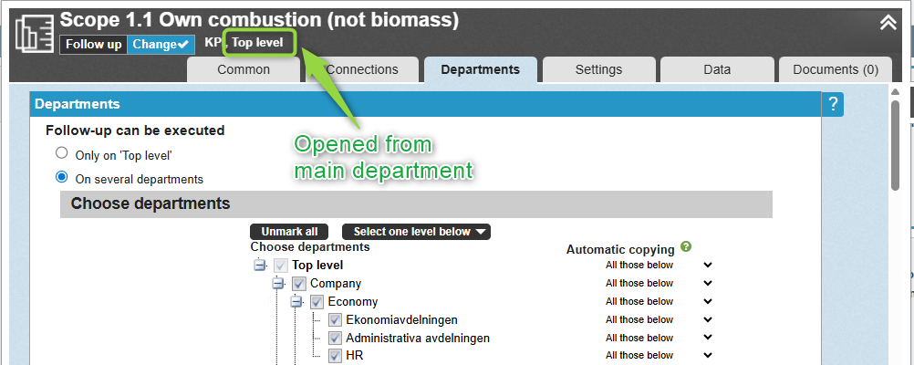 If you want to remove departments other than the top level from a measure, you typically deselect them in the organization tree and save—for example, in the image below, you would deselect Economy to remove the measure from this and all its underlying levels.