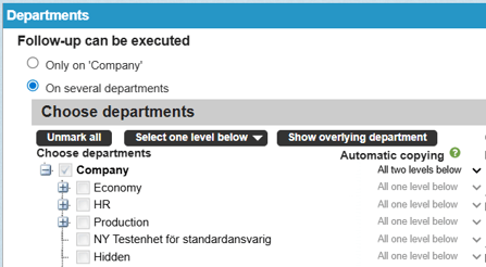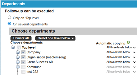 If automatic copying was enabled from the unit, it will be carried over to the underlying departments, and the number of levels for automatic copying will be recalculated accordingly.