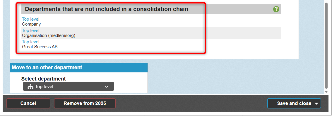 The Remove from current department function is primarily intended for removing nodes from the top-level department but is available at all levels in the consolidation chain.