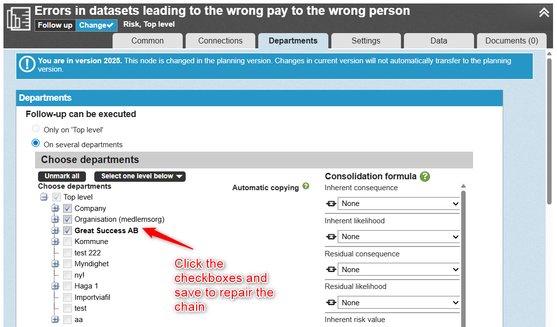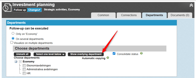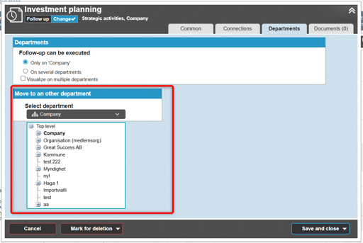 Sometimes the responsibility for measures and activities needs to be transferred to other departments. A common use case is the desire to change the main department for the node so that another department takes over responsibility. There are several functions available to support this, depending on what you want to achieve.