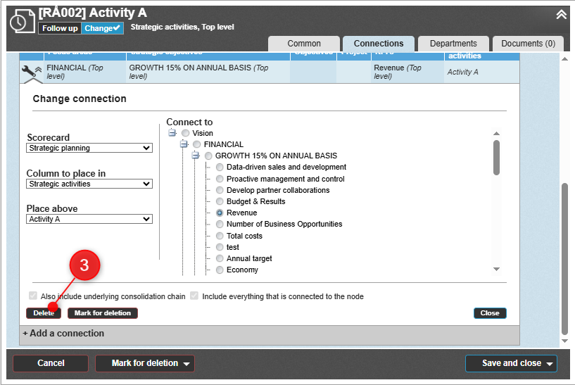 A bit of theory first: A node must always be linked to at least one scorecard. Therefore, you need to first add a connection to the scorecard you want to move it to before removing the original connection. The node will thus temporarily have two connections.