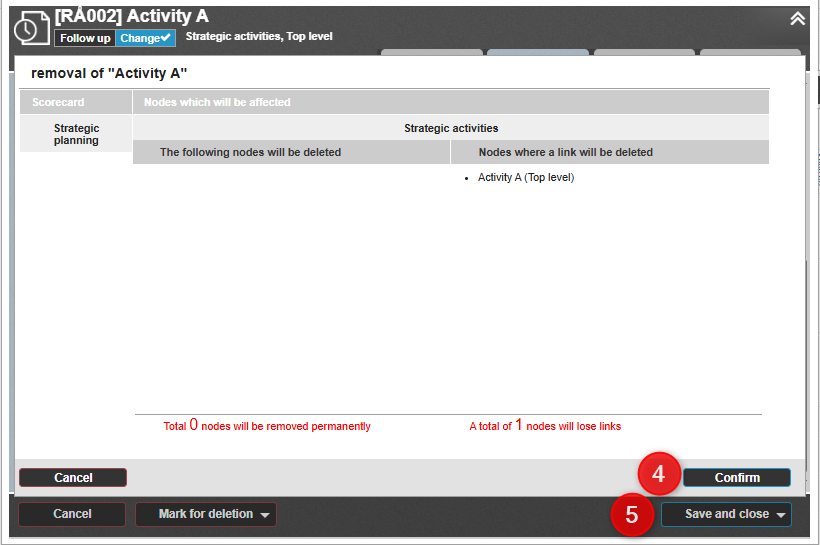 Nodes that are connected to this node in the scorecard you are now removing it from will be deleted, unless they also exist in another scorecard.