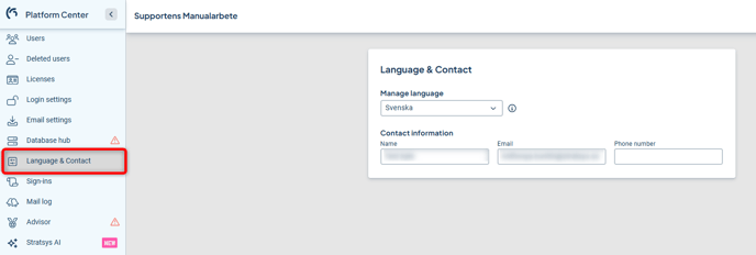Language settings for the entire platform can be found in the Platform Administration under the menu "Language & Contact." Here, users with the role of platform super administrator can change the language for the entire platform.