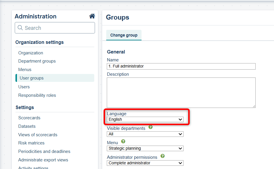 Note: The user needs to log out and log back in for the language change to take effect. This also applies when the user changes the language themselves.