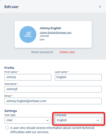 As an administrator with a platform role, you can change the language setting for an individual user via the platform. Users can also change their language preference themselves through their own account settings.
