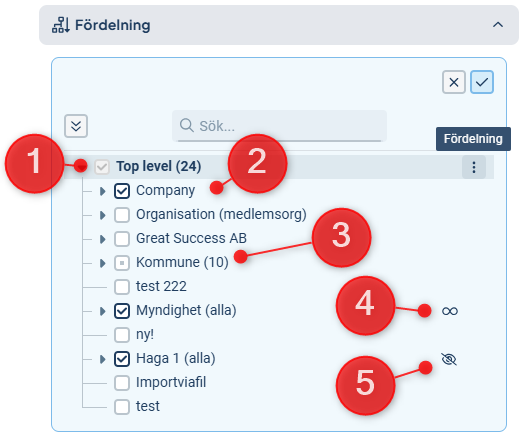 When you hover the mouse over a department, a context menu (three dots) appears on the right. Here you can manage the distribution for the underlying departments (2).