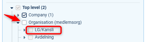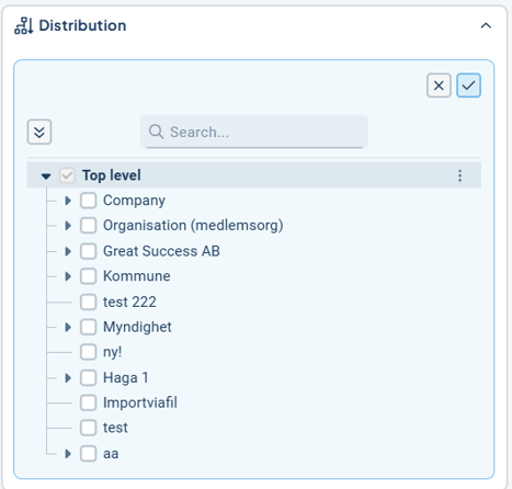 Solution: Also distribute the object to intermediate departments. In the example below, it is not possible to distribute to "LG/Kansli" before distributing to "Organisation".