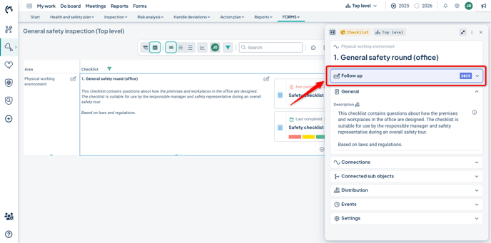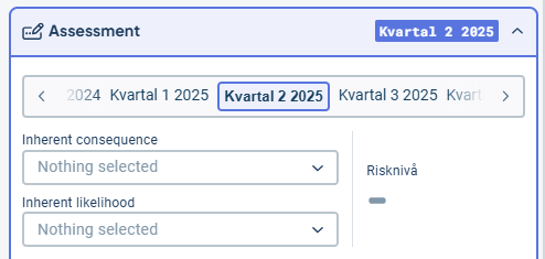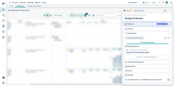 You can report data for indicators and risks directly from the object window. When you click on this type of object, a purple box will appear at the top with the text “Follow up” for indicators and “Assessment” for risks.
