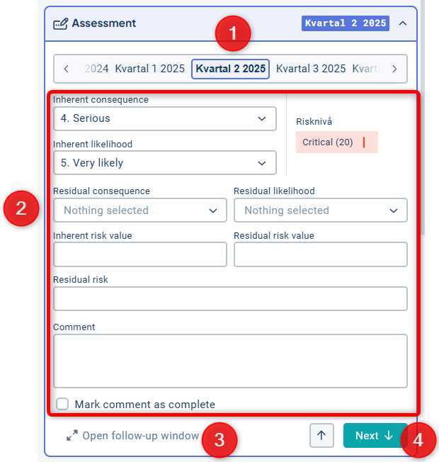 The relevant data columns for follow-up are displayed below the period selector. Here you report the outcome of the indicator or risk (2).