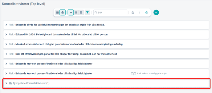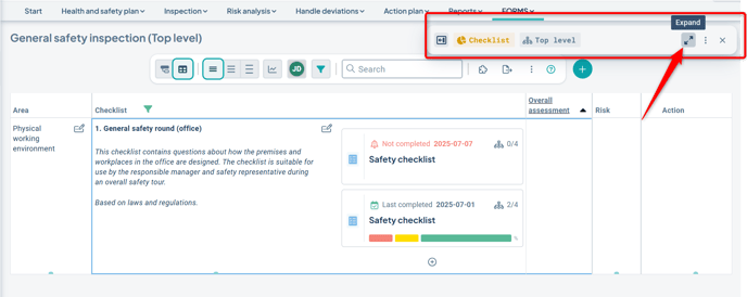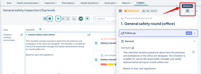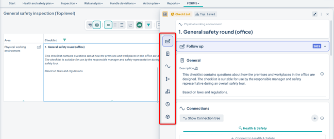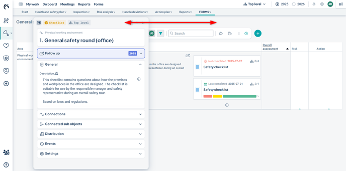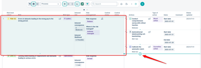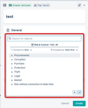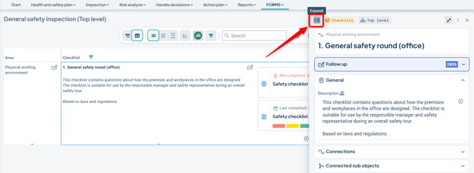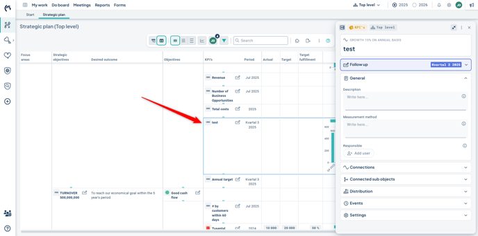 From the view type "New Table-Tree Structure View", you create and edit items in the object window that expands to the right in the view when you click on the object. You can also report data directly in the window for indicators and risks.