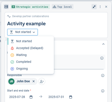 For actions and activities, you can change the status, which is located above the General section, as well as modify the start and end dates.