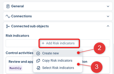 If the view is structured in a way that allows it, you can directly create linked sub-objects in the object window, such as Risk Indicators.