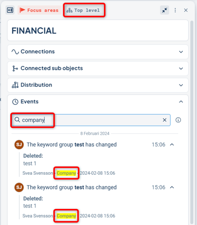 For text objects, you can also view events related to comments and responsibility roles that apply to underlying levels. You can also search by organizational level to find changes in these.