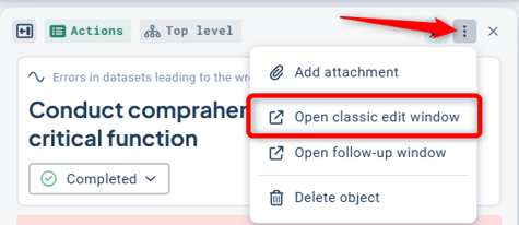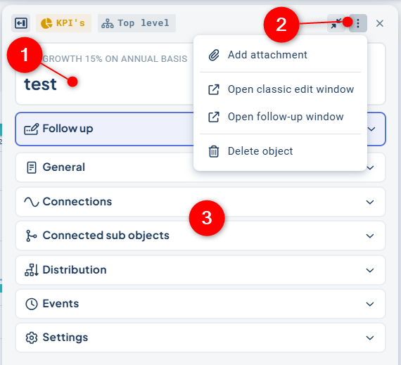 2) Via the three-dot menu in the upper right corner, you can access the classic edit window, the follow-up window, and delete the object.