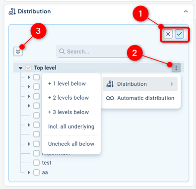 In edit mode, you confirm or cancel your changes to the distribution using the "check mark" and "cross" icons in the upper right corner (1).