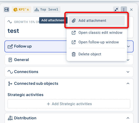 Add attachments and links in the object window by clicking the three dots in the upper right corner and selecting "Add attachment."