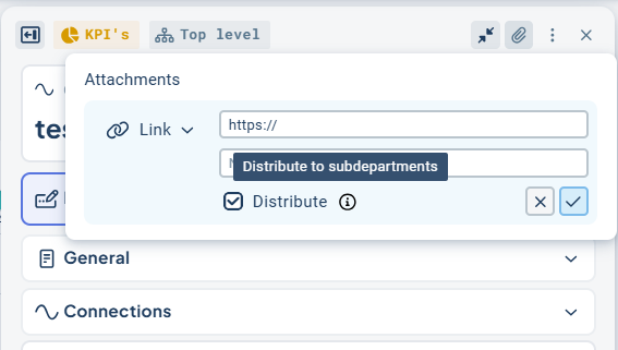 You can choose whether the attached material should be distributed, that is, accessible to the subdepartments that can view this object. In that case, check the box. You can only choose "none" or "all" subdepartments for the distribution of the attachment.