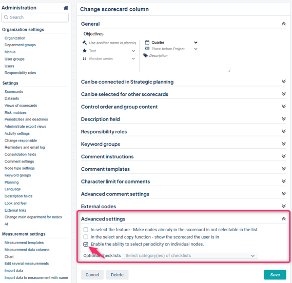 This is enabled per scorecard column under Advanced settings. Check the box for Enable the ability to select periodicity on individual nodes.