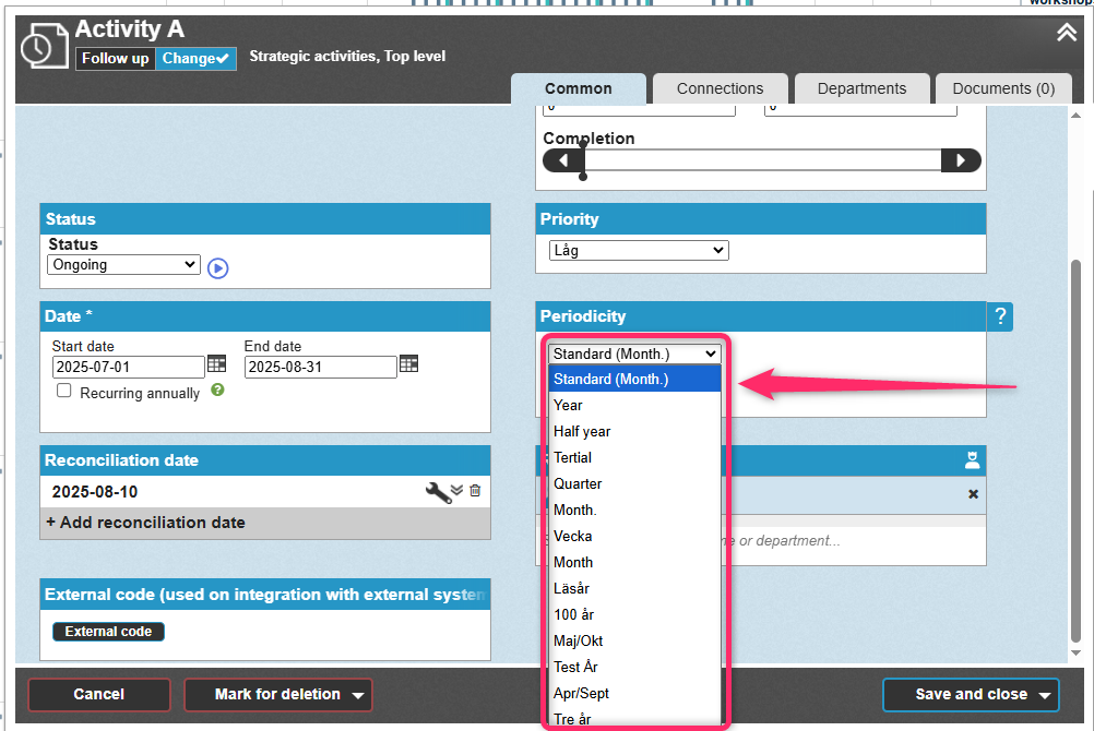 For nodes that already have a deviating periodicity, this setting is retained, and the deviating periodicity will continue to be displayed in the edit window. However, if you switch back to the default periodicity, the setting will also be removed from these nodes.