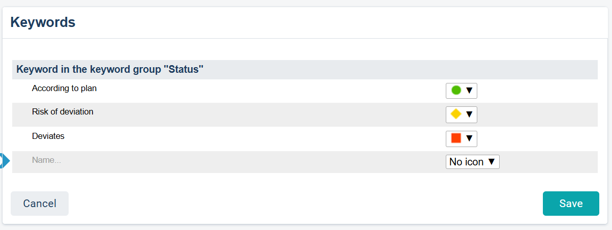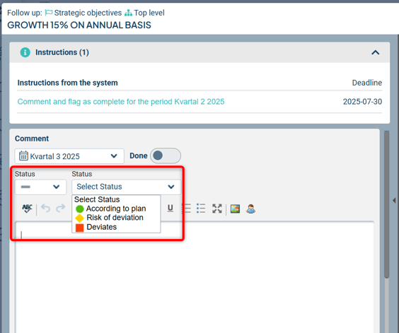 The keyword group Status is periodized. The keyword group is included in the Strategic Planning scorecard and then in the Strategic Objectives scorecard column. It consists of three keywords that must be set for each follow-up period in connection with a comment.