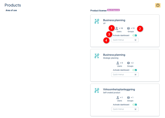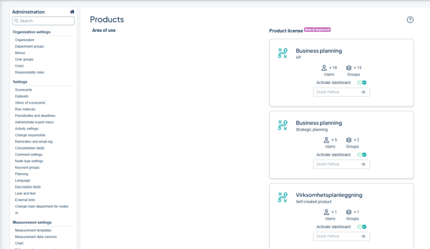 When you navigate to the administration section in Stratsys, you arrive at the product page. Here, you get an overview of the areas of use you have, as well as the products that are activated in your database.