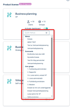 - Access a quick menu to the menus, permission groups, and management models linked to the product. The quick menu (dropdown) allows you to go directly to the specific settings for that product.