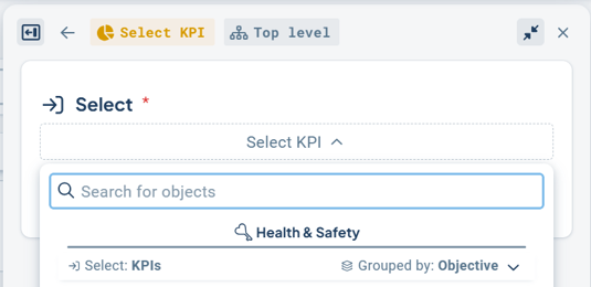 First choose product / scorecard. Search for and select the object(s) you want to copy. You can group the objects by different columns to make it easier to find the right ones. Confirm your selections at the bottom right.