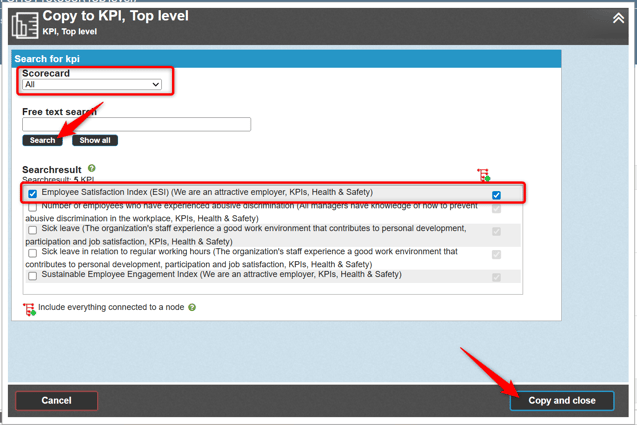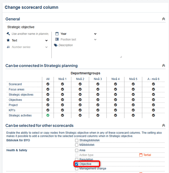 In the example image, we allow selection from the text node "Strategic objective" from Strategic Planning to the text node "Objective" in the scorecard "Strategic Planning". Both have the periodicity "Term". Save and close.