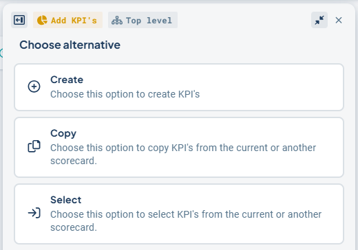 If, however, you do not want a separate copy but instead want to work with the same objects in another scorecard, you should use the "select" function instead. See also "select from another scorecard".