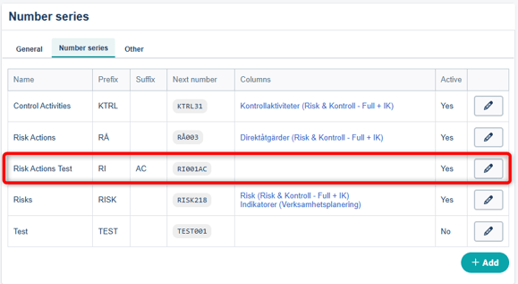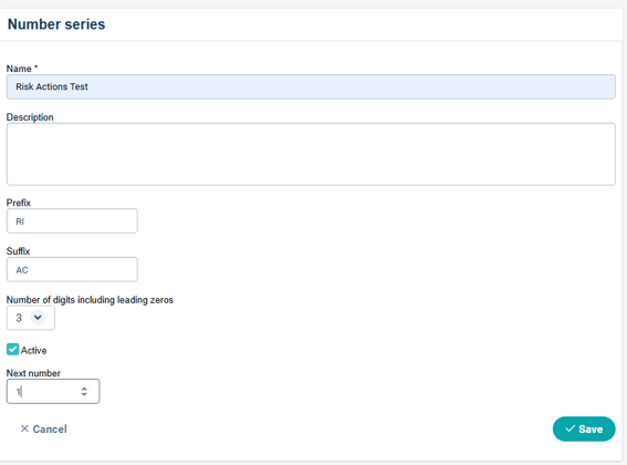 You add new number series in the administration section under Scorecards, then the Number series tab. To create a new number series, click Add. Fill in the desired fields. The fields Description, Prefix, and Suffix are optional and do not need to be used. Save.