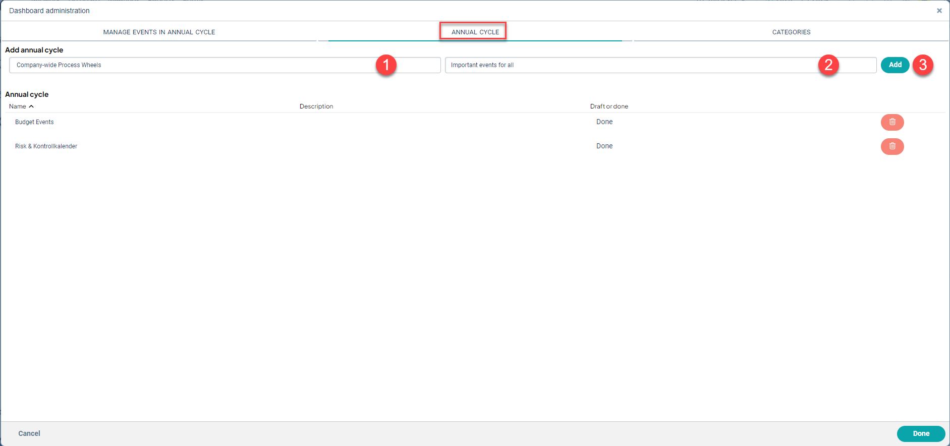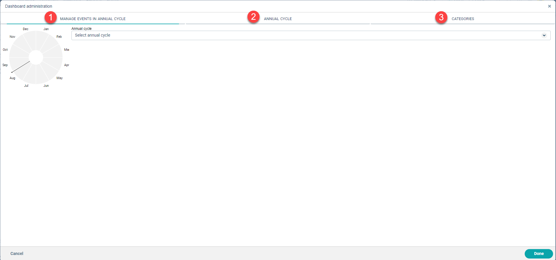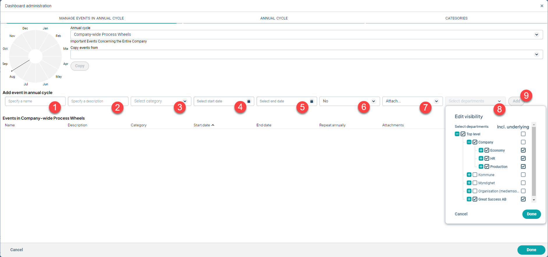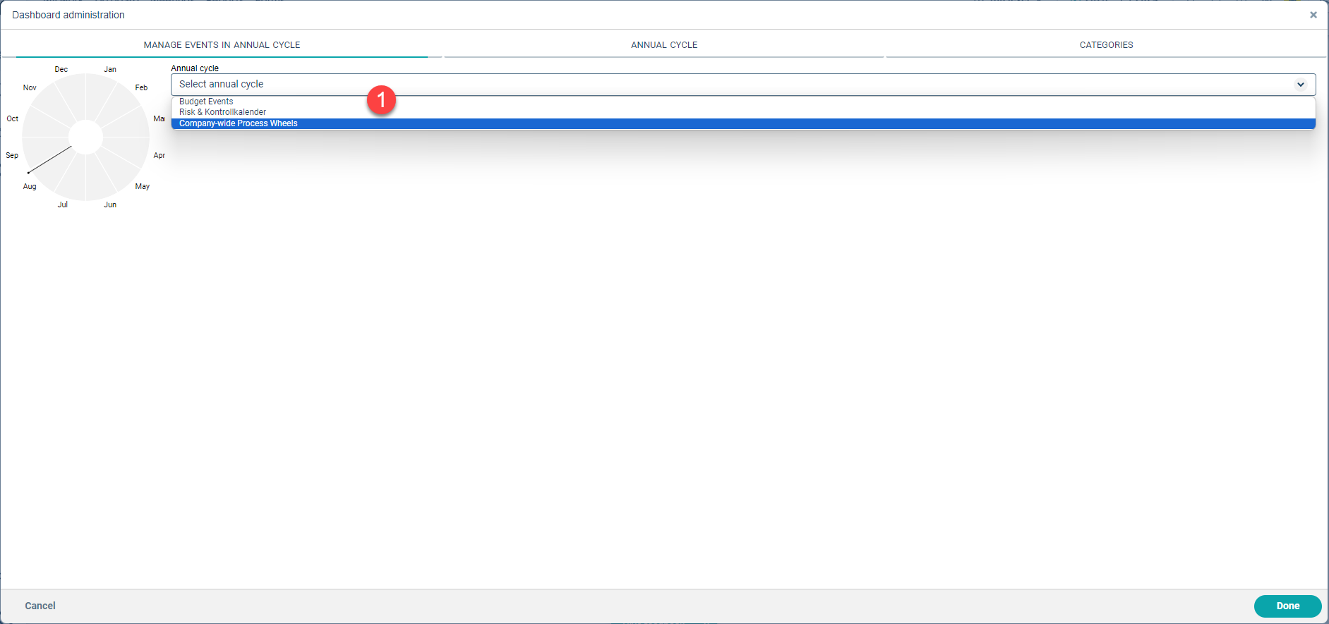 The process wheels showcase important events within your organization that you wish to keep track of and possibly be reminded about. The process wheels and their events are created centrally and can then be displayed on various dashboards. The events can be categorized, allowing for filtering, and they can also be set to repeat annually.
