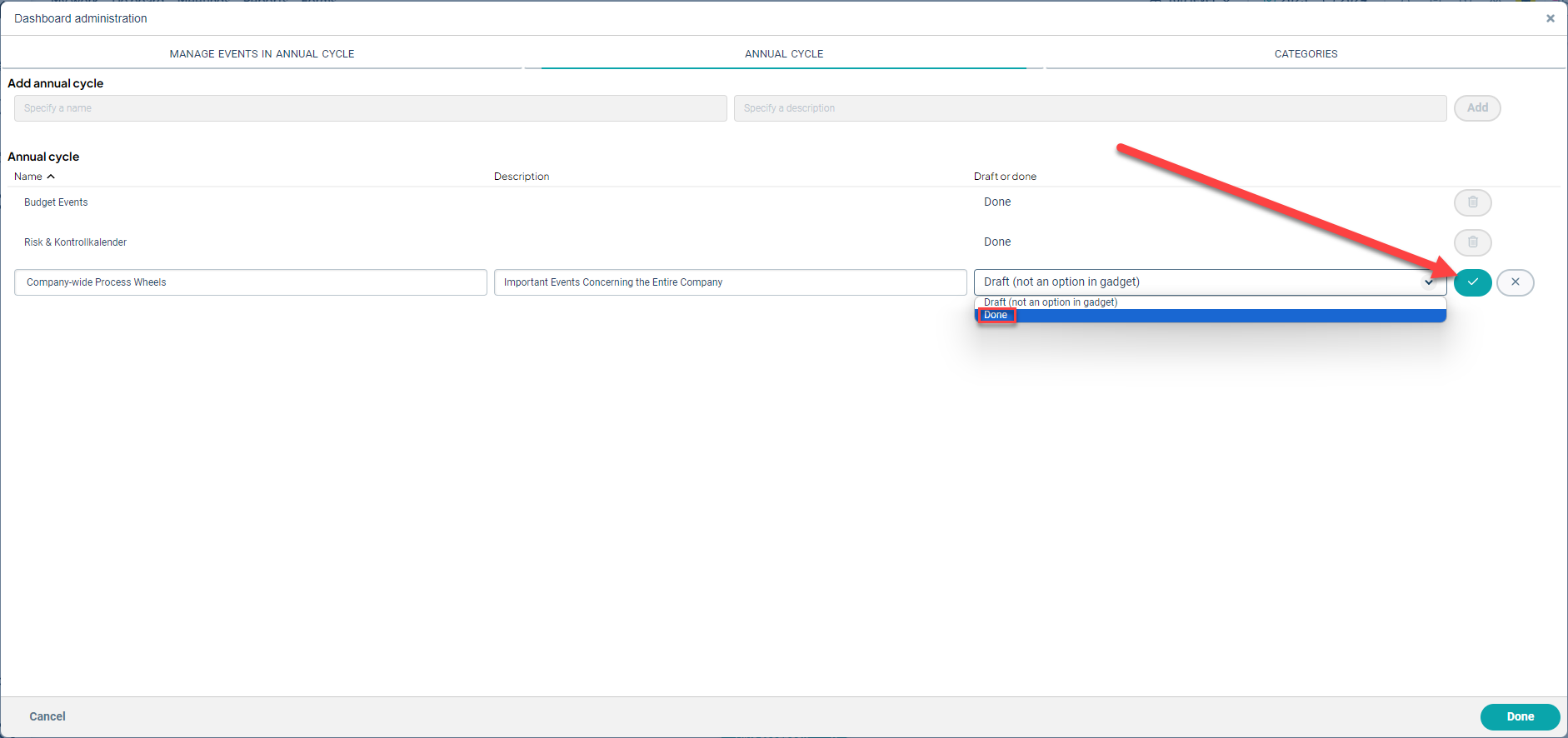To mark it as ready, click on your process wheel in the table - in this mode, you can also change the name and description if necessary: