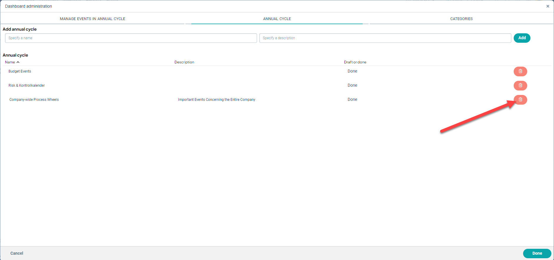 To delete a process wheel, click on the trash can icon to the right of the process wheel. However, please note that no categories will be removed, as they are shared among all process wheels.