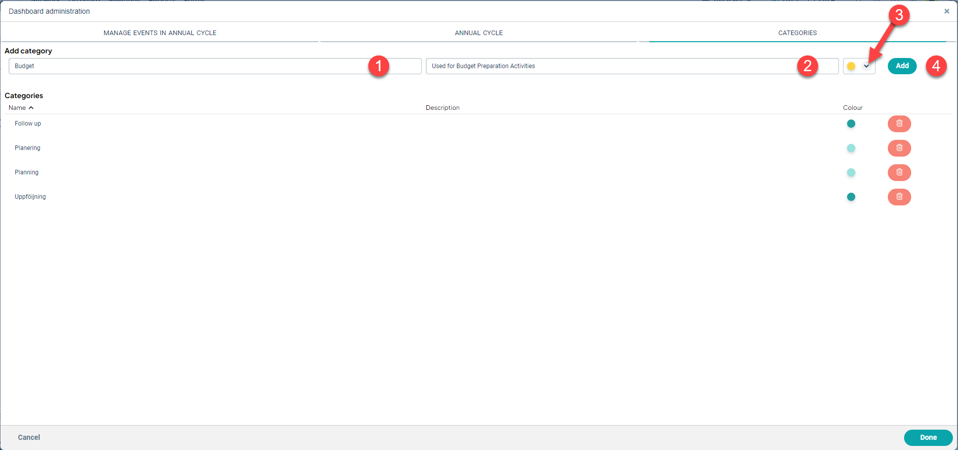 3) Categories - This is where you create categories to classify your events for clearer visualization.