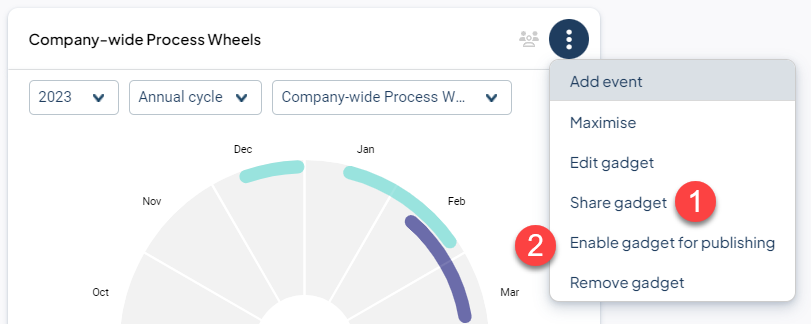 To publish a gadget with a process wheel, the gadget needs to be shared with the relevant departments.