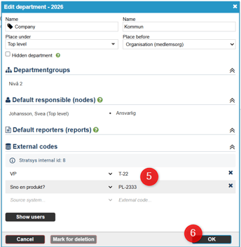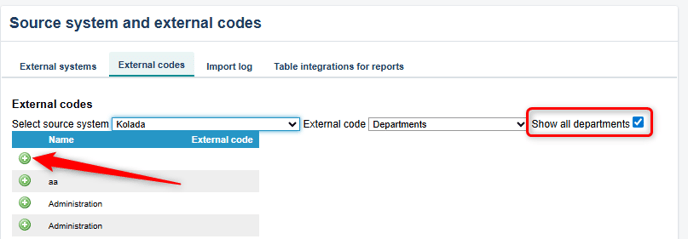You also have the option to add new external codes, for example to nodes or units that currently lack an external code. To do this, check the box "Show all ___". By clicking the plus icon
