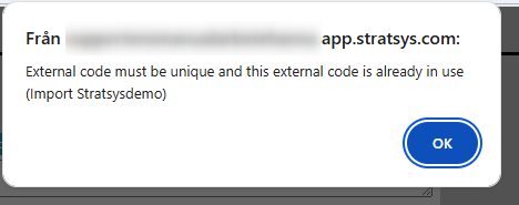 An external code can only be entered once per source system. This means that if you use Qlik Sense for both KPIs and table integration, it is possible to reuse the external codes. However, it is not allowed to use the same external code for, for example, two different units within the Qlik Sense table integration. Doing so will result in the following error: