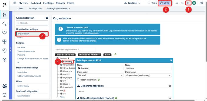 Open Organization in the administration section to edit the unit for which an external code should be entered. Click on the unit you want to add an external unit code for.