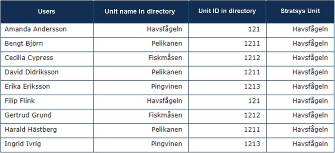 At the care facility Havsfågeln, there are three departments (Fiskmåsen, Pingvinen, and Pelikanen), each with its own staff, as well as a management and support function belonging to the root unit Havsfågeln. In Stratsys, however, only Havsfågeln exists as a unit, so users from these four units need to be mapped to the root unit Havsfågeln.