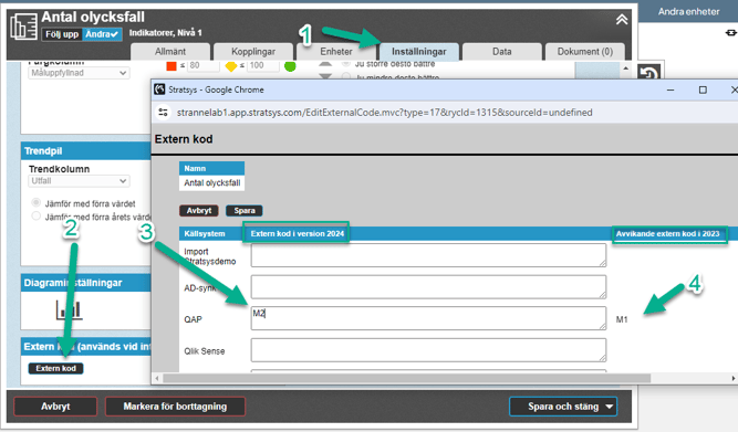 2. Go to the view where your KPI is located and click the wrench icon to open the edit window. Navigate to Settings (1) and click on External Code (2). Enter the external code that should apply in the planning version (3). If the KPI has an external code in the current version, it will be displayed to the right in the pop-up window (4).