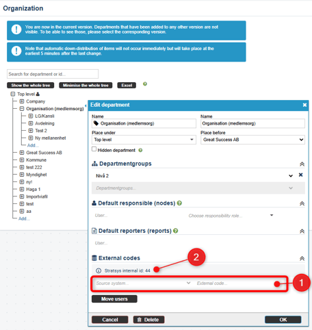 The term "external code" is used by Stratsys to translate an external system’s internal codes and terms into the organizational units, KPIs, and KPI columns used in Stratsys. Before external codes can be created in Stratsys, a source system must be set up.