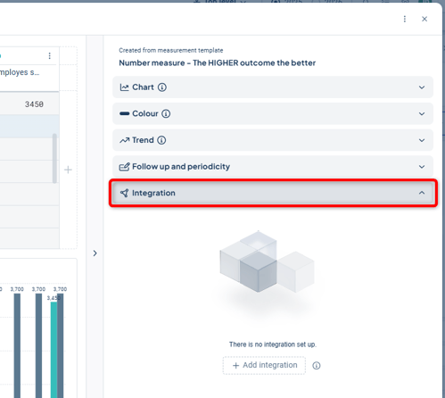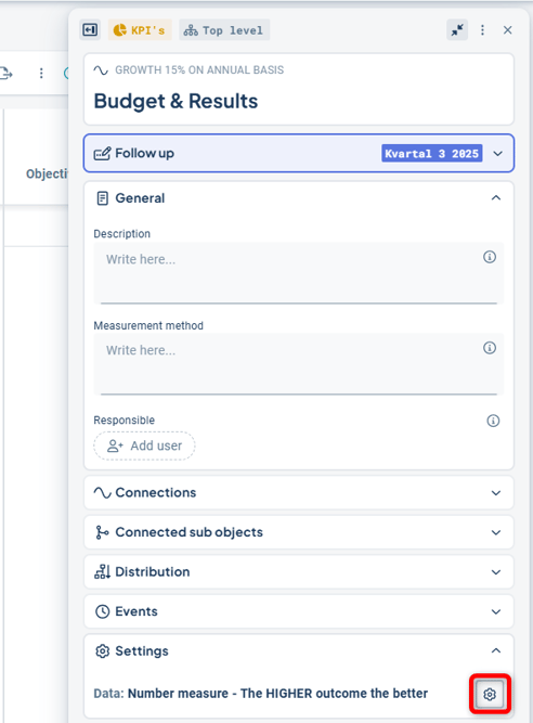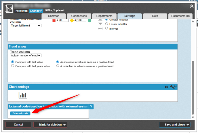 Open the measure where the external code is to be specified by clicking on the relevant measure so that it opens on the right-hand side of the view. Expand Settings and click the wrench icon next to "Data: XXXXX".