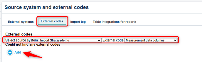 To specify an external code for KPI columns, this is done in the Administration under Source Systems and External Codes. Select the "External Codes" tab. Choose the desired source system from the dropdown list and select "Measurement data columns" in the dropdown for External Code. Click the Add button to add an external code for the KPI column.