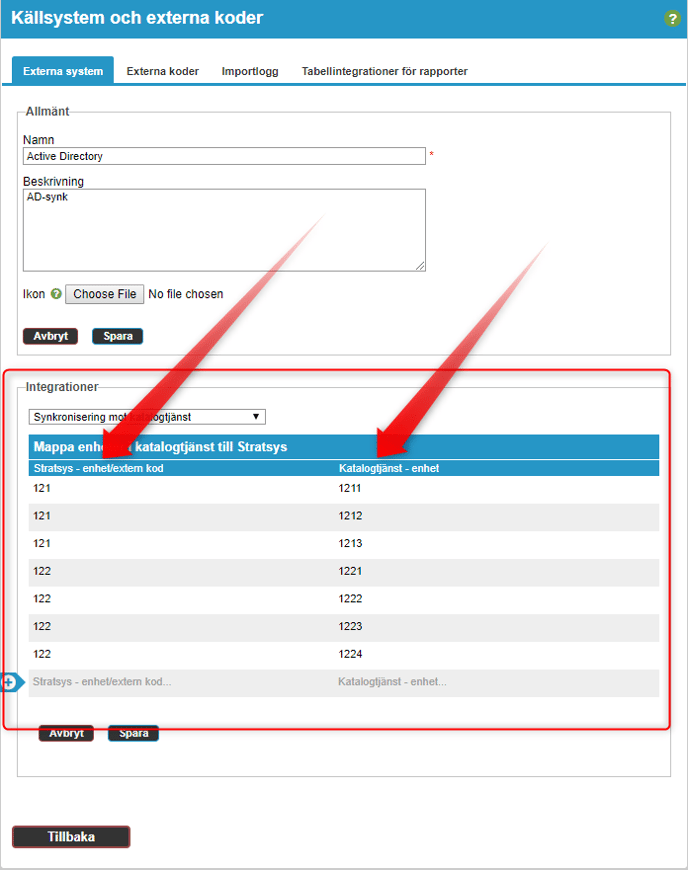 To add external codes for N-1 mapping, go to Administration > Source systems and external codes > Source systems. Open the source system using the wrench icon. The unit mapped under 1-1 is entered under Stratsys unit/external code on the left. The multiple units are mapped on the right, under Directory service – unit. Click Save to finish.